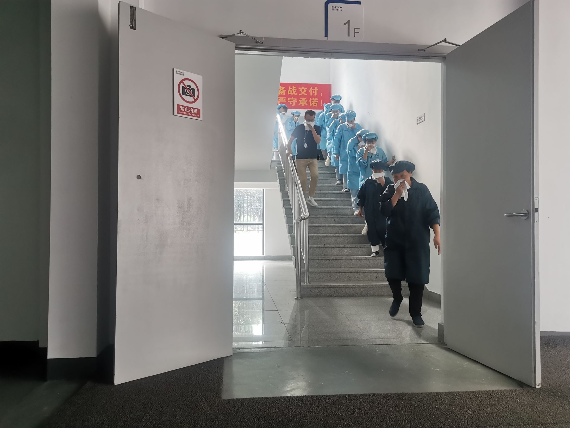 隨著消防警報拉響,緊急逃生預案啟動。員工們一邊解除門禁、切斷電源、撥打救援電話、打開大門等待救援人員到達。一邊用濕毛巾捂住口鼻,井然有序地從辦公區域向指定安全區域轉移。